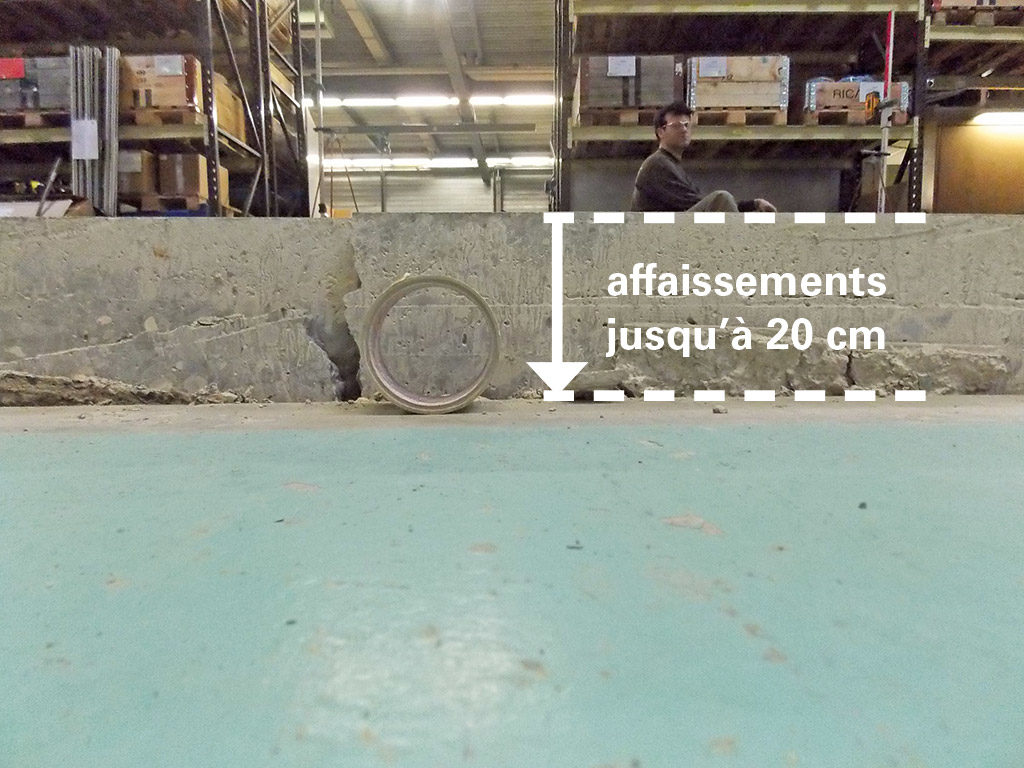 Le sol de la zone partielle de la halle de fabrication, d’une surface de 340 m2 env., est constitué de 6 dalles de béton d’env. 7.5 m x 7.5 m de surface et d’une épaisseur d’env. 30 cm. Les appuis de la halle, disposés selon une grille de 7.5 m x 15 m, reposent respectivement sur des semelles isolées fondées sur des pieux d’env. 16 m de profondeur. Au cours du temps, les 6 dalles qui ne reposent sur les semelles isolées des appuis que sur leurs côtés extérieurs, se sont affaissées unilatéralement de près de 20 cm vers la partie centrale. Le basculement des dalles de béton a provoqué la création de cavités sous le sol de la halle à l’endroit des appuis.